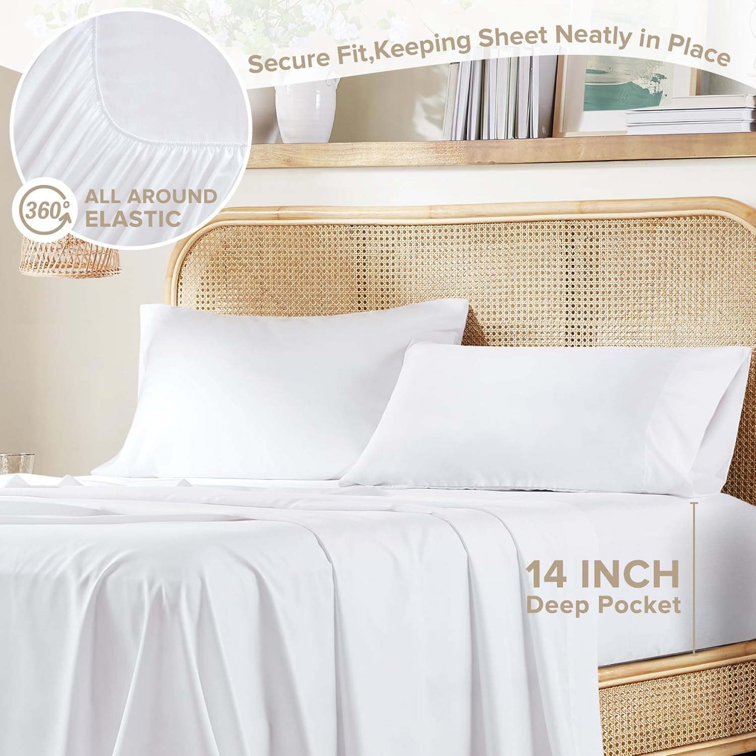 Cool-Touch Elegance rayon-bledn sheet set made from a silky-smooth poly-rayon blend (bamboo-derived), this sheet set offers breathable, cool comfort with a refined heathered finish and natural luster for a modern touch. Wrinkle-free and non-fading, it features a 14" deep all-around elastic pocket for a snug fit on most mattresses. Easy care—just machine wash cold on gentle and tumble dry low.