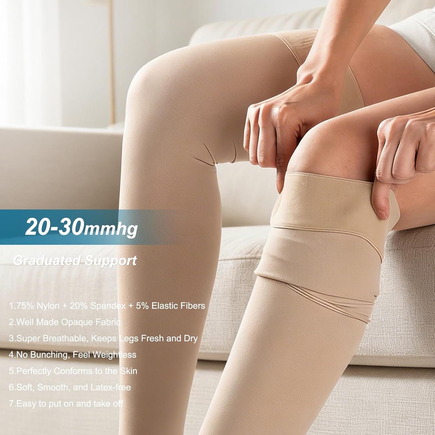 DCCDU Compression Stockings 20-30 mmHg – Graduated Support for All-Day Comfort & Leg Health Experience the perfect balance of medical-grade support and everyday comfort with DCCDU's 20-30 mmHg compression stockings. Designed with a seamless circular knit, they offer a soft, silky feel and a lightweight, fashionable look—so you can feel confident while caring for your legs. Key Features: 1. Precision Compression Technology Just like leading medical brands, we take 4–6 compression measurements at precise intervals from ankle to thigh. This ensures an accurate pressure gradient that boosts circulation, reduces swelling, and helps prevent tired, achy legs—all while supporting leg health with physician-prescribed elastic compression therapy. 2. Advanced Comfort & Moisture Control Our Absolute Advanced Comfort fabric wicks moisture away from your skin to the outer layer, where it quickly evaporates. This keeps you cool, dry, and comfortable—even during long hours of wear. 3. Relief for Common Leg Issues Ideal for preventing and relieving symptoms of spider veins, mild varicose veins, ankle swelling, edema, and leg fatigue. The graduated compression also offers a gentle shaping effect for a smoother look. 4. 3D Ergonomic Design & Easy Wear Crafted from high-elastic micro fiber that’s delicate, strong, and velvety-soft. The 3D knit fits your leg perfectly without rubbing at the heels, while the soft yarn construction makes these stockings easy to put on and take off. 5.Care Instructions To maintain elasticity and performance, we recommend hand washing in warm water with mild soap after each use. Gently rinse and squeeze—do not twist or wring. Air dry away from direct heat. Do not machine wash or tumble dry.