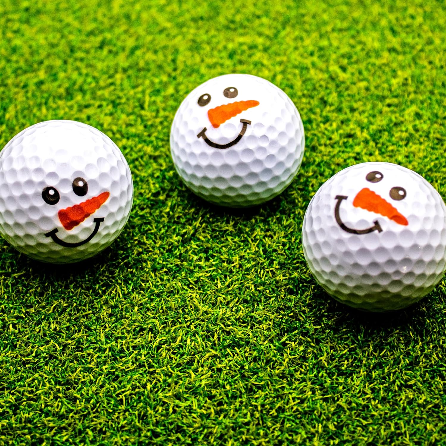 12 White golf balls with a full color Snowman Imprint. 12 pack Printed Novelty golf balls 2-piece Tournament quality balls Solid core construction 352 dimple pattern Great as a collectable or playing on the course