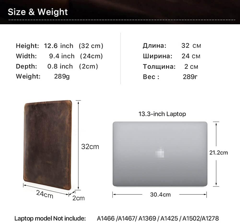 Hiram Crazy Horse Cow Genuine Leather Series Ultrathin Laptop CaseTIPS: Laptop model NOT include: A1466/A1467/A1369/A1425/A1502/A12781.Hiram Promise100% new and high quality genuine leather and lining material;Please make sure your order from Hiram products.2.Package Include:1 pc leather case for 13.3" Ultrathin Laptop Case.3.Specification: Size:leather 13.3" Case:LxWxH 24x2X32 cm NOTE:Due to the difference between different monitors and light,the picture may not reflect the actual color of the item. Thank you!