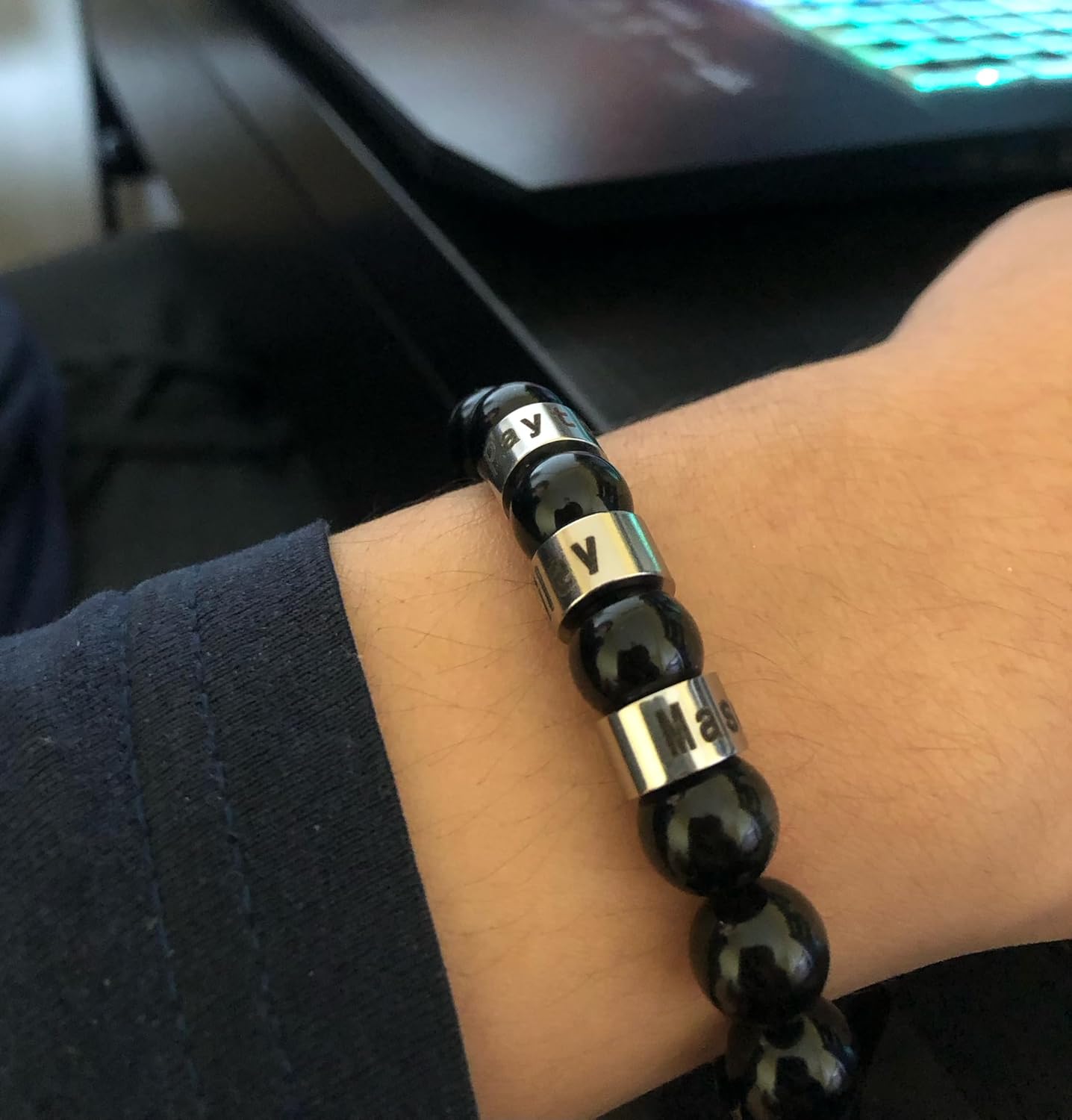Personalized men's beaded bracelet with kids' names engraved on steel tube beads. The cusstomized braclet is designed for men to have the personal touch on. This is a meaningful father's day gift for Husband, Son, Boyfriend, Dad, Grandpa There are 4 kinds of nature gemstone beads to choose: Tiger's Eyes, Lava rock, Agate, and Obsidian, all are 10mm in black, Yellow, Red color. The metal bead with gold or silver color options is made by stainless steel which tarnish free, hypoallergic, no color change. Personlization: please choose how many steel beads of your bracelet. Each Steel bead can engrave one name or a date. You can also pick a symbol letter from my last picture. Choose your length as you needed. Default length:8" for elastic cord one and 7"+2" for clasp one. Custom length up to 9" without extra cost but leave message to last customization option.