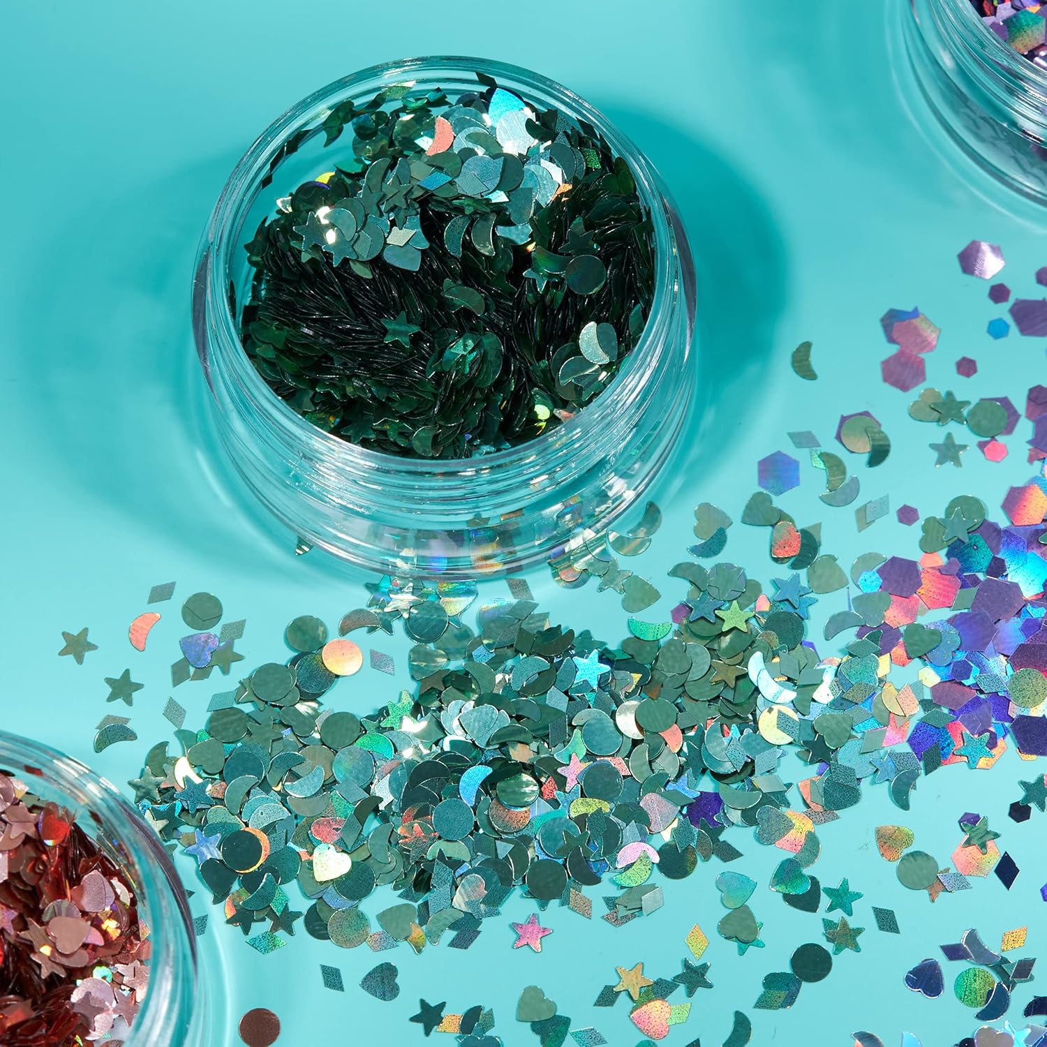 Available in a variety of colours, shapes and sizes, Moon Glitter is made up of small cuts of cosmetic glitter which will add a sparkle to any occasion. Our glitter is perfectly safe to apply to the face, hair and body and can be removed easily using just water.So whether you are going on a night out, or to a festival, be prepared to shimmer the night away!To apply the glitter, we recommend using Moon Glitters Fixing Gel, Lip Glue, Hair Glue and Nail Glue for the best results.All Moon Glitter cosmetic and special effect products are made right here in the UK! All of our cosmetics are cosmetically certified and conform to EU1223/2009. Moon Glitter products are never tested on animals.Pack includes Silver, Gold, Pink, Green, Blue, Fix Gel