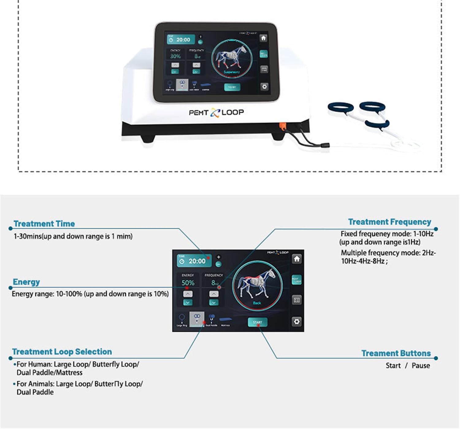 Magnawave PEMF Therapy Equine PMST LOOP for Horses's Re Muscle Soreness and Pain Relie with 6000GS Energy Using PMST LOOP for Race Horses PMST LOOP aids a horse in the post workout routine by assisting in recovery and reducing the soreness associated with muscle strain and lactic acid build up. PEMF helps a horse to train at its best, compete to its fullest, and bounce back from injury or work as quickly as possible. Regular use of PEMF relaxes the horse, reduces aches and pains, and improves general wellness. The effects of PEMF are: Cell membrane potential is normalized Oxygen partial pressure increases Calcium influx enters the cell Field strength at the coil: 1000-6000GS Pulse frequency: 1-10Hz Output power: 850W Standard handle : Large single ring and small double ring Package size: 600mm*595mm*440mm Gross weight: 29KG Fused: 15Amp IP rating: IP31