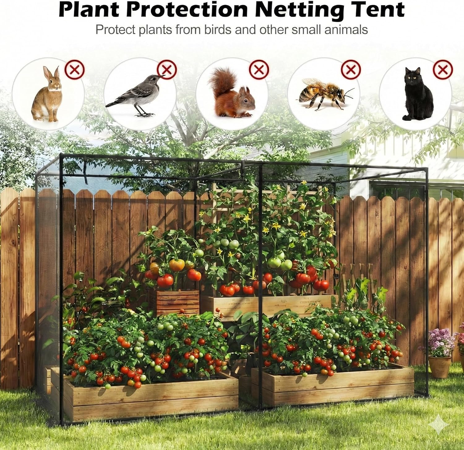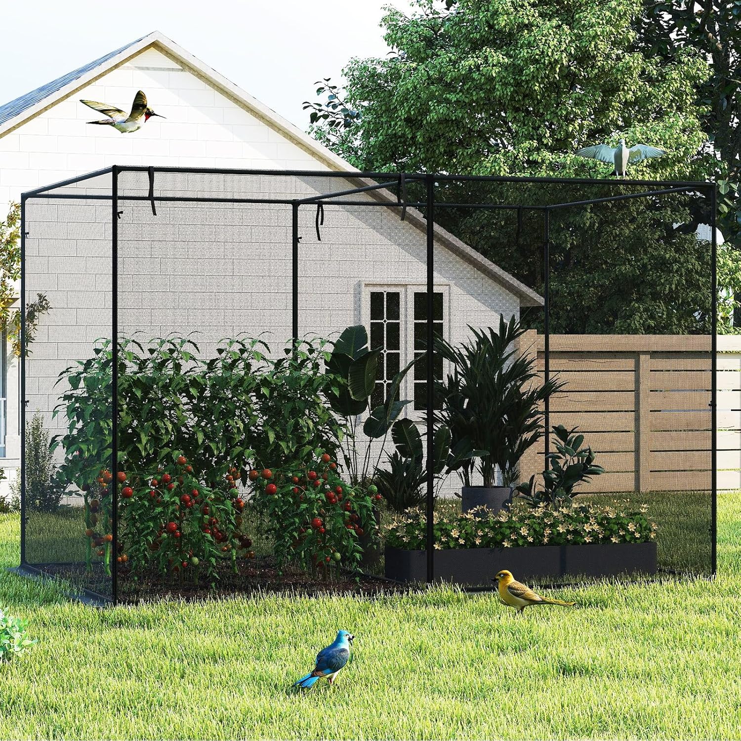DescriptionProtect your garden plants effectively with our spacious and sturdy crop cage. Measuring 10 ft in length, 6.5 ft in width, and 6.5 ft in height, it offers generous space for your vegetables, fruits, flowers, and other plants to thrive. Constructed from powder-coated metal pipes with reinforced joints, this cage provides a durable and wind-resistant frame.The cage is equipped with tear-resistant mesh netting that shields your plants from birds and small animals, while 6 metal ground stakes and an extended edge allow you to secure it firmly—using stones if needed—for increased stability. Convenient zippered rolling doors on both sides permit easy access for watering, care, and harvesting, with smooth zippers ensuring hassle-free entry.Lightweight and portable, the crop cage includes a black Oxford fabric carrying bag for effortless transport, assembly, and storage. It's an ideal solution for use in gardens, yards, and lawns to safeguard your crops year-round.FeatureLarge dimensions (10 x 6.5 x 6.5 ft) for ample plant growing space Durable, tear-resistant mesh netting with a powder-coated metal frame Reinforced joints and straps for extra stability Secured by 6 metal ground nails and an extended edge for stone placement Dual zippered rolling doors for easy access and plant care Smooth zippers enable hassle-free operation Includes Oxford fabric carrying bag for portability and storage Simple assembly and disassembly Suitable for protecting vegetables, fruits, flowers, and more SpecificationColor: Black Materials: Powder-coated Metal, Oxford Fabric, Nylon Overall Dimensions: 10 x 6.5 x 6.5 ft (L x W x H) Door Size: 5 x 6.5 ft (W x H) Carrying Bag Size: 39" x 11" x 5" (L x W x H) Net Weight: 13 lbs Package Contents:1 x Crop Cage 1 x Carrying Bag 6 x Metal Stakes 1 x User Guide