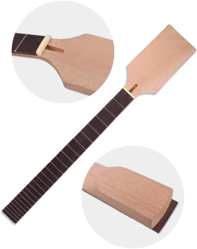 1. Solid Mahogany Build for Warm & Resonant Tone Crafted from a single piece of premium Mahogany, this neck produces a rich, warm, and resonant tone with enhanced sustain. Paired with a smooth Rosewood fingerboard, it offers a classic feel and superior sound quality for any playing style. 2. Direct Bolt-On Replacement (24.75 Inch Scale) This neck is designed as a perfect drop-in replacement for many popular 24.75-inch scale bolt-on guitars. Featuring a standard 4-bolt heel and precise machining, it ensures a secure fit, easy installation, and authentic vintage playability. 3. Fast 24-Fret Rosewood Fingerboard Without Binding Experience effortless playability with a full 24-fret Rosewood fingerboard. The "without binding" design provides a sleek, modern look and allows for lightning-fast runs and easy access to the entire upper register, ideal for lead guitarists. 4. Standard Normal Nut for Easy Customization The neck comes equipped with a standard "normal nut" width, ensuring broad compatibility with aftermarket nut replacements and tuning machines. This makes your setup process straightforward and allows for personalized string spacing and action. 5. Upgrade to Classic Vintage Vibe with Modern Access Transform your guitar by installing this classic-spec neck. It combines the iconic warm tone of a Mahogany/ Rosewood construction with the extended reach of 24 frets, giving you the best of both worlds: vintage character and modern performance.