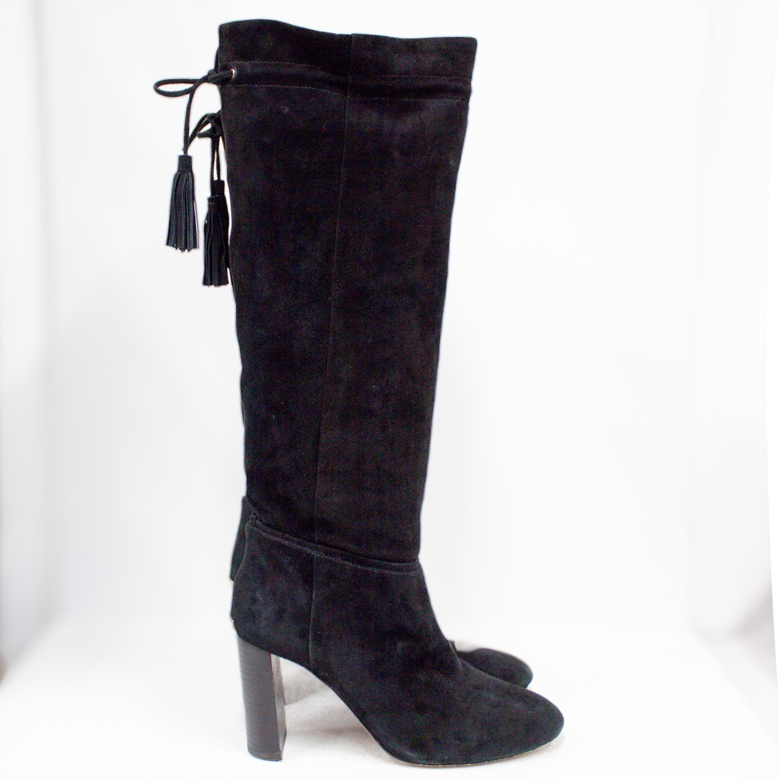 Elegant knee-high boots in supple black suede. These boots feature a classic silhouette with a stylish block heel for comfortable elevation. A charming tassel tie detail at the back adds a touch of sophistication.