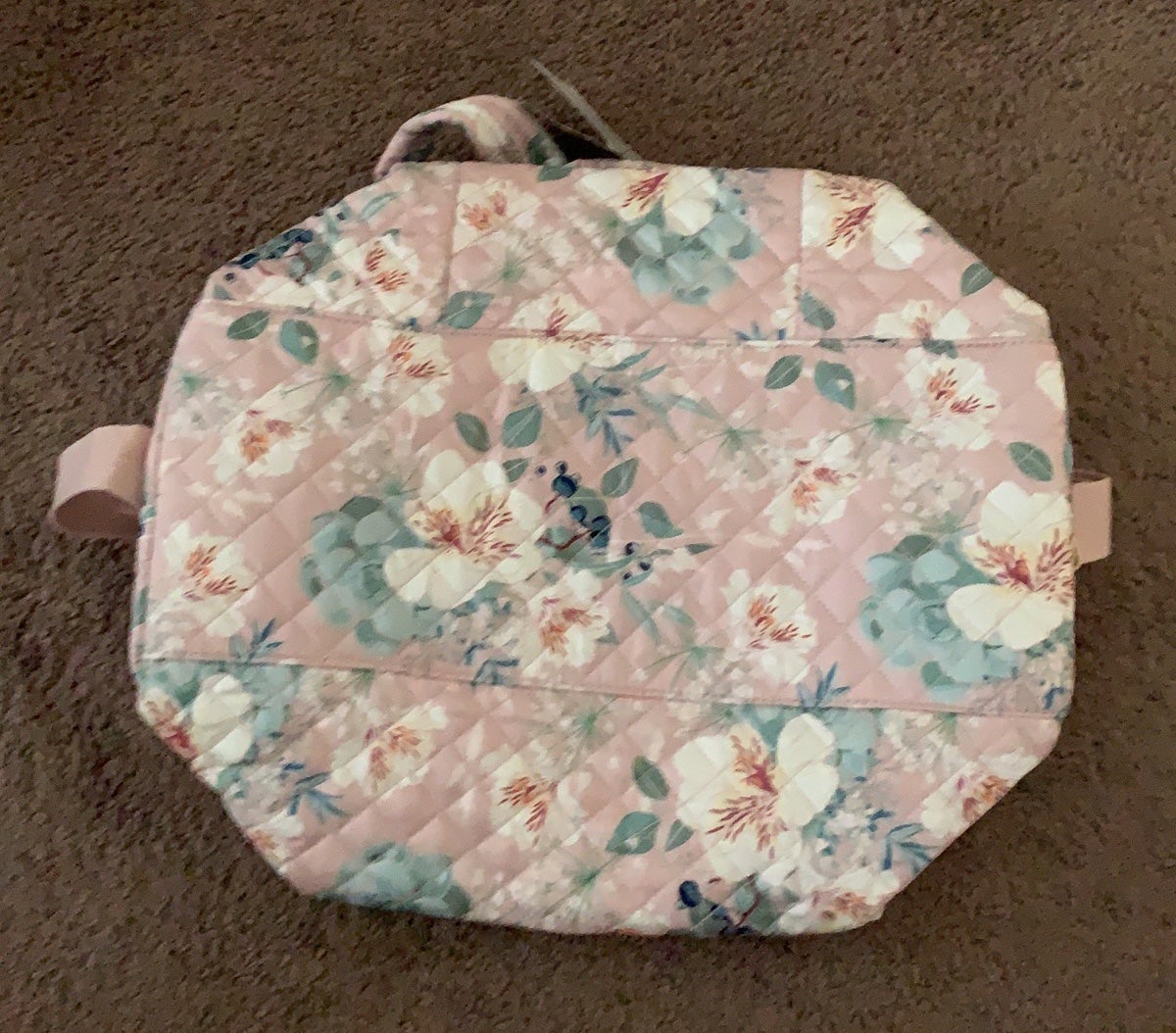 A medium sized duffel bag in a beautiful pink with blush floral design. It features 2 inner pockets, 1 inner zipper compartment, 1 outer zipper compartment, and 2 big outer side pockets. Perfect for traveling or long road-trip!.