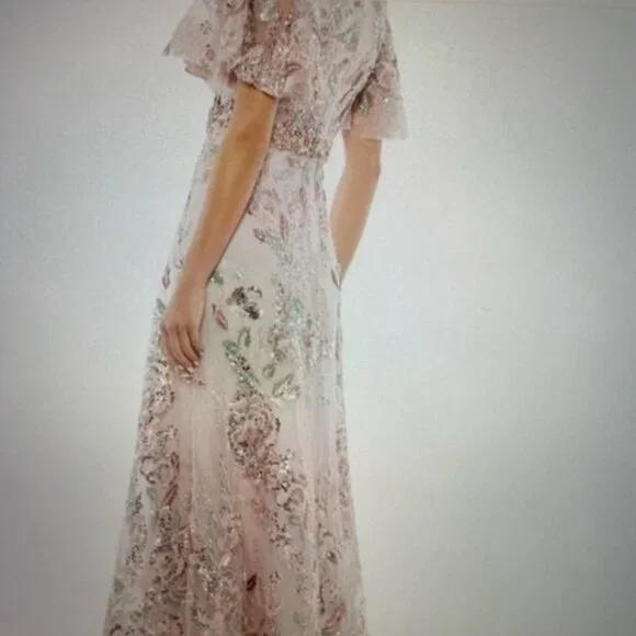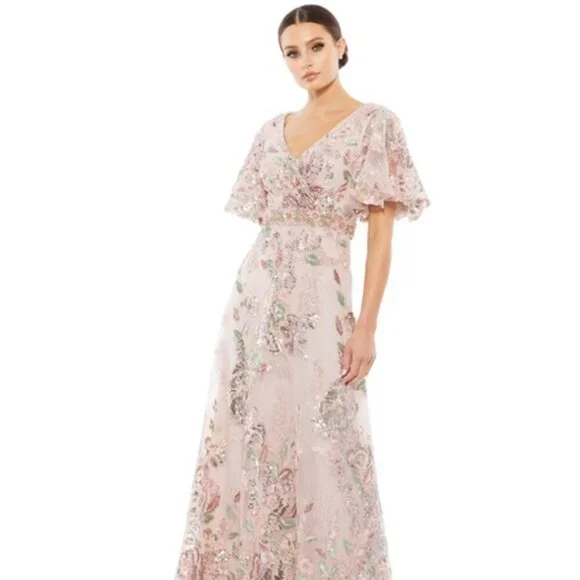BRAND NEW w/Tags!!! Stunning beaded gown - Size 16Flirty and feminine full-length gown with sheer bell sleeves and a faux-wrap v-neckline. The mesh overlay features stunning floral embroidery and beading throughout. A bead-and-rhinestone belt accents the natural waist.Designer: Mac DuggalEmbroidered Fabric (100% polyester)Fully linedV-neckShort flutter sleeveEmbellished beltFaux wrap bodiceBack zipperApprox. 62.5" from top of shoulder to bottom hemAvailable in Rose Pink Style #67880