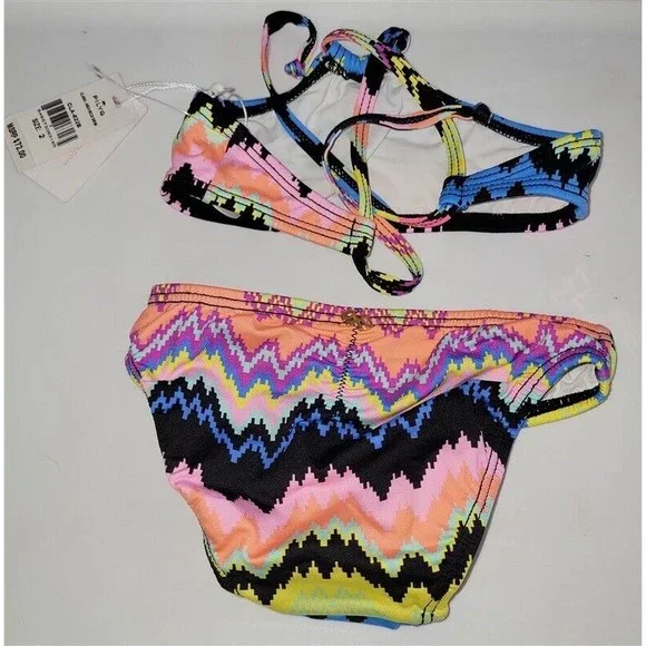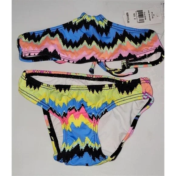 The Girl's Clara High Neck Bikini Set by PilyQSize 2New with tags features a high neck halter top with criss-cross back straps paired with a matching full cut bottom in an adorable multi-color zig-zag print. PilyQ Girl's Clara High Neck Bikini Set CLA-822B Fully lined Polyester/Spandex blend Halter straps crisscross and tie to close in back Full coverage Slight ruching on the back bottom *This bikini is sold together as a set *PilyQ runs small, we recommend ordering a size up