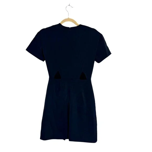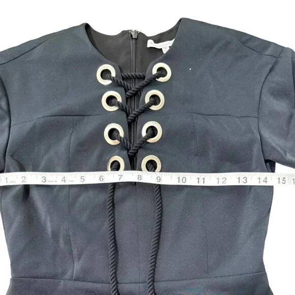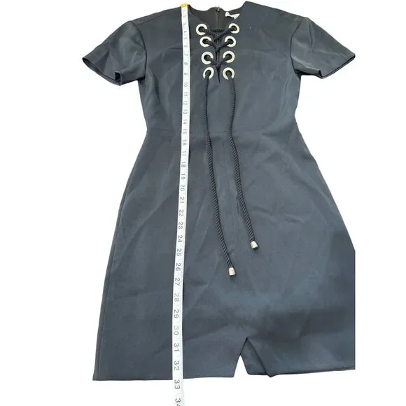 This Rebecca Minkoff mini dress features a stylish lace-up grommet detail, adding a contemporary touch to the classicdesign. Its short sleeves and tailored fit provide a sleek silhouette that is suitable for various settings. Note: the color is a very dark navy blue (almost black).• Lace-Up Grommet Detail• Short Sleeves• Mini Length• Back Zipper Closure• Tailored FitCheck out my closet for other great deals! Buy 2 or more items to receive 10% off.