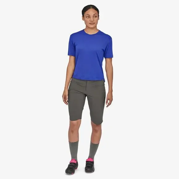 * Patagonia Women's Dirt Roamer Bike Shorts * Articulated, sonic-welded seams reduce weight and allow the shorts to stretch as one garment while eliminating chafing during prolonged saddle time; clean, minimalist styling increases versatility between rides * Curved waistband follows the natural shape of the hips; slightly slim through the seat and legs to provide a contoured fit and help keep shorts in place during long rides * Snap loops pair with our Endless Ride Liner Shorts or Dirt Craft Bike Shorts * Separating zip fly and new mountain-bike-specific OppoSet adjustable waist customizes the fit * Secured zip pocket on left thigh; tonal logo at left hem and right-back hip * Light, stretchy, moisture-wicking fabric dries fast * 11.5" inseam length covers tops of knees and low-profile knee pads * 4.1-oz 90-denier 87% recycled polyester/13% spandex with 4-way stretch and a DWR (durable water repellent) finish * Color: Forge Grey * MPN 24726