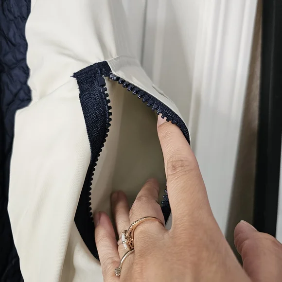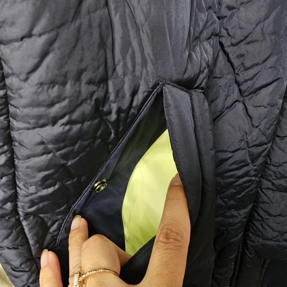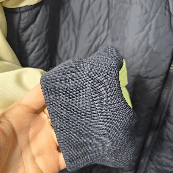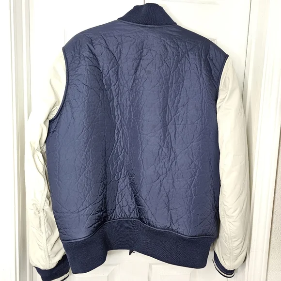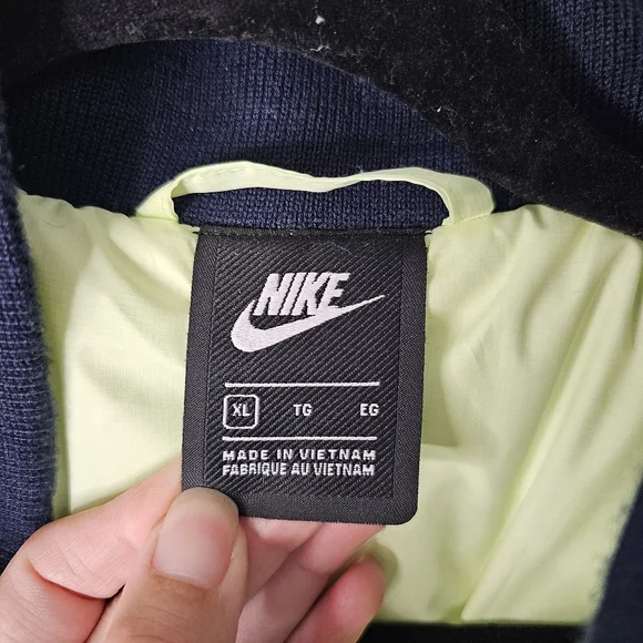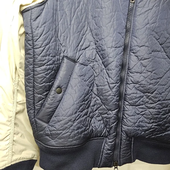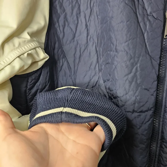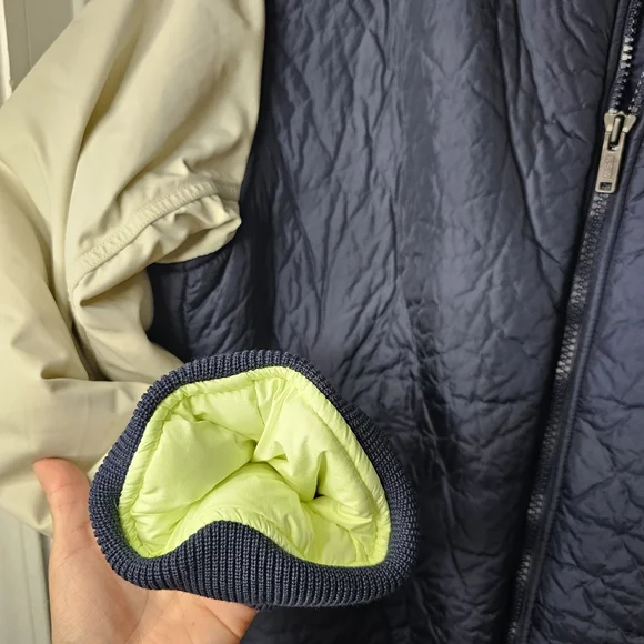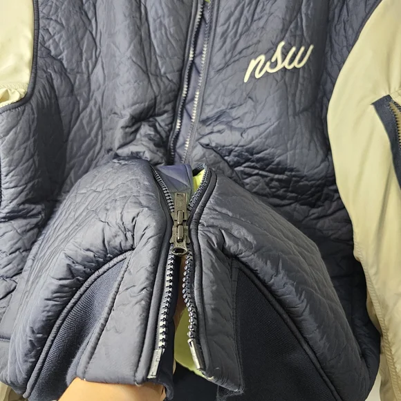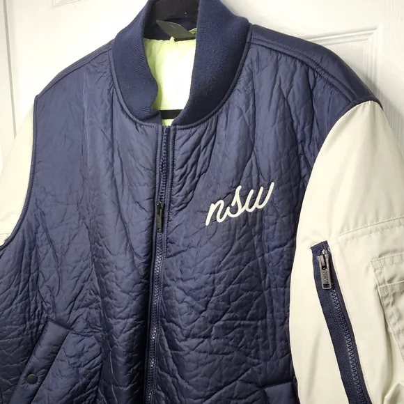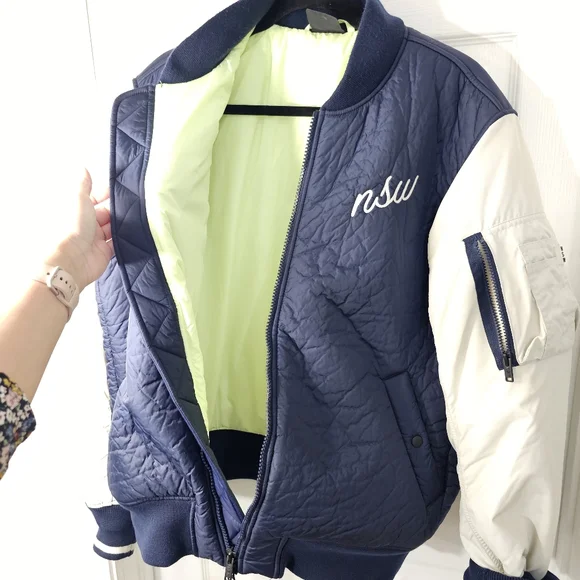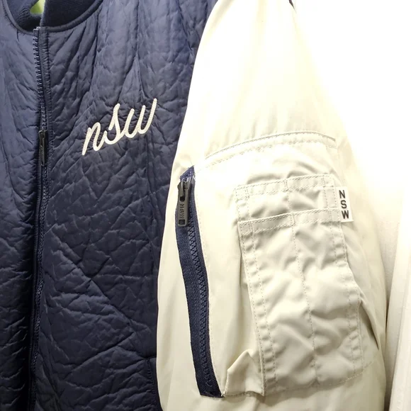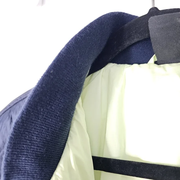 Gently WornBut great condition. There is only minor pilling from normal wearVery warmPockets with button claspsLime Green Interior Color of outer jacket is Navy Blue With bone color sleevesZippered pocket on the armGives me a 50's Bomber Jacket stylePlease refer to all pictures and ask any questions you may have prior to purchasing thank you NSW Embroidered on side chest