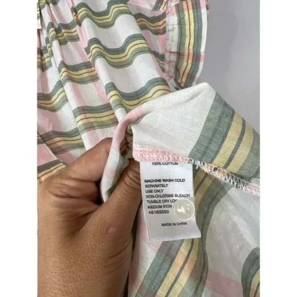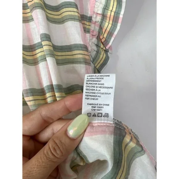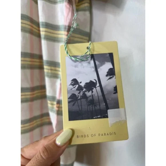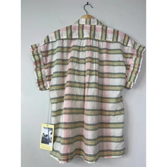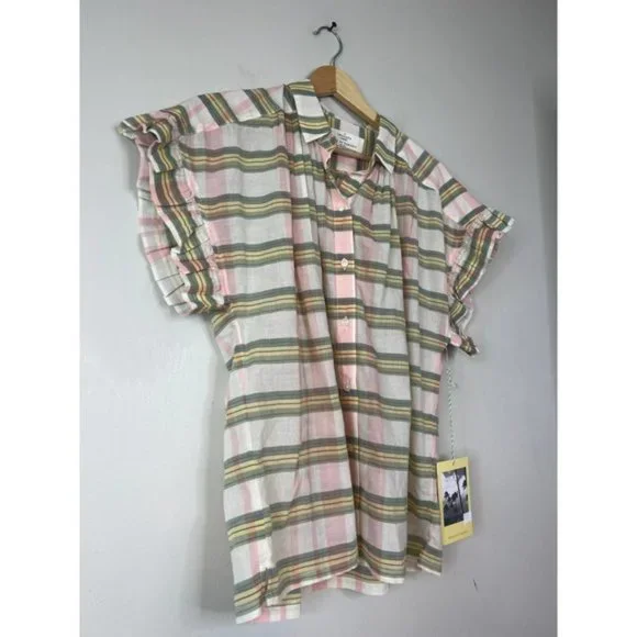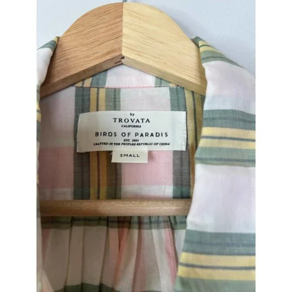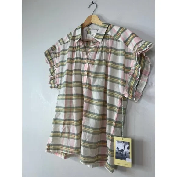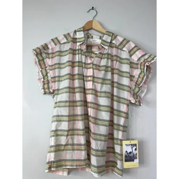 Birds of Paradis Trovata Marianne B Ruffle Sleeve Top Pomela Plaid. New with tag!Size: SmallFabric: 100% CottonMachine washDesigned with a lived in feel, so it is not too preciousClassic details that will last generationsEasy to dress-up or dress-downOur classic Marianne "B" Blouse has our signature feminine twist with the ruffle sleeves and easy gathers at front and back body. The slightly cropped body has short side slits, completed with antique white buttons.ruffled, buttonup, vneck, plaid, casual, comfy, soft, cropped, sideslits, modern, chic, summer, winter, fall, springBirds of Paradis Trovata Marianne B Ruffle Sleeve Top Pomela Plaid
