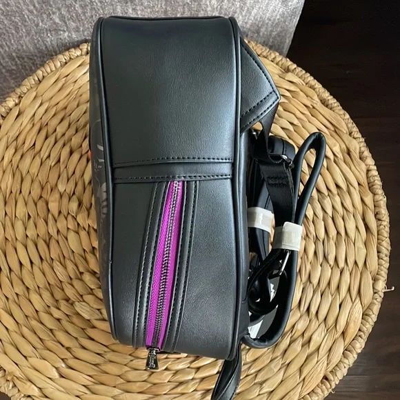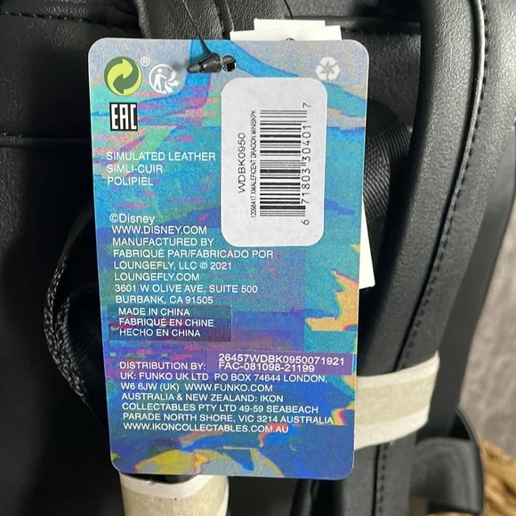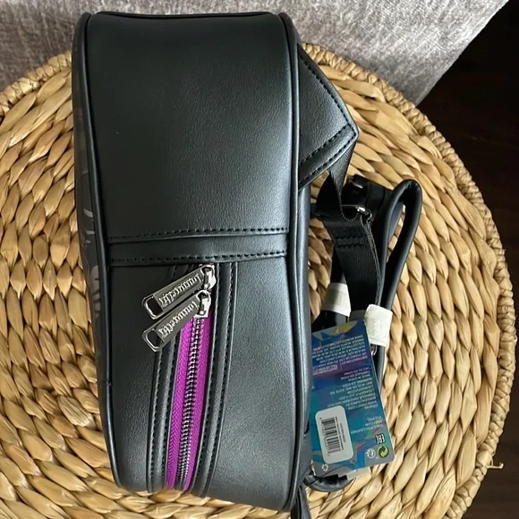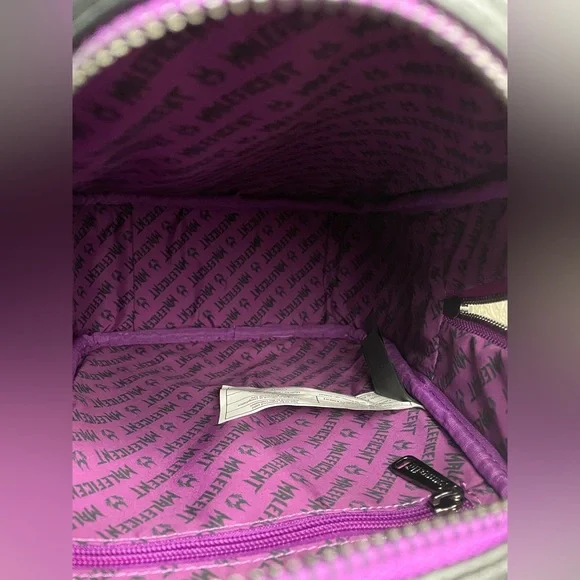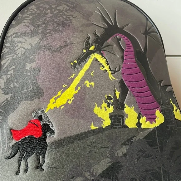 Loungefly Maleficent Dragon with Prince Phillip Disney Villains Mini Backpack & Maleficent Sleeping Beauty Scenes Zip Around Wallet SetMaleficent Dragon with Prince Phillip Disney Loungefly Villains Mini Backpack has Embroidery Details, Top Carry Handle, Interior Zip Pocket, Purple Lining with Maleficent Logo, Exterior Dual Sided Slip Pockets, Double Zip Fastenings, Adiustable Padded Shoulder Straps, Pewter Tone Hardware, and Cloisonne Disney × Loungefly Pewter Tone Logo. Materials: Faux Leather. Measurements: 11.8” H x 9.8” W x 5” D. Care Instructions: Wipe Clean with Damp Cloth. Condition is New with Tags.Maleficent Sleeping Beauty Scenes Disney Loungefly Villains Zip Around Wallet features seven credit card slots, Credit Card Viewer, Interior Zip & Slip Pockets. Measurements: 8” H x 4” W x 1” D. Materials: Faux Leather with Appliqué and Printed Details. Care Instructions: Wipe Clean with Damp Cloth. Condition is Brand New with Tags.