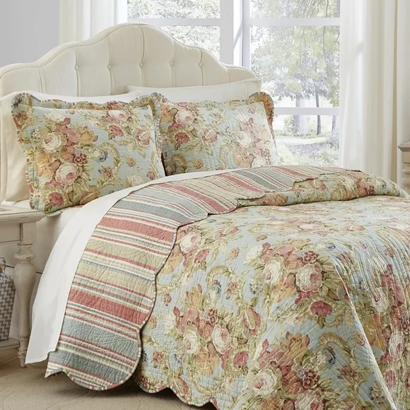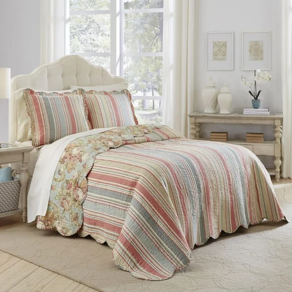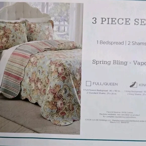New in box 100% Cotton . BEDDING SET - King sizebedspread set includes one reversible bedspread (110"x 120") and two coordinating reversible pillow shams (21"x 36") . BEAUTIFUL DESIGN- This bedding offers a large- scale classic floral pattern in delicate hues of vintage red, blush pink, vapor blue, parchment, taupe, and sage green. It reverses to a to a coordinating variegated stripeItem being purchased is 10lbs, addition shipping fees will be purchased by seller. (last photo for reference of poshmarks charges for exceeding 5lb limit)Please make reasonable offers.