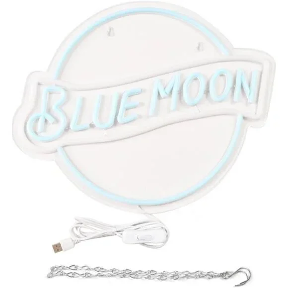 BRAND NEW // SHIPS FAST🧿🎇 Spark Your Space! 🎇: Convey an attitude to life and create a cheerful party atmosphere with this neon sign Blue Moon! Perfect for decorating your living room, bedroom or your workstation with your office.🧿🤞 Easy to Install 🤞: Mounted on a high quality clear contour cut base plate with two pre-drilled holes (send a hanging chain), it is both easy to install and easy to move. Simply hang the neon signs on the wall and you will experience a unique atmosphere.🧿🗽 Safety and Durability 🗽: Compared to old-fashioned glass neon signs, neon lights tubes do not heat up and can be touched with confidence. This eco-friendly LED light sign (14*12.2 inches) is powered by USB cable (5 feet/1.4 meters) with clever design and supports brightness adjustment for long use.🧿🎁 Perfect Gift & Decoration 🎁: Blue Moon LED signs can decorate your personal style and create a unique atmosphere. Adding "Blue Moon" neon lights signs can liven up any dull space and is an essential bar decoration. It is also an ideal gift for weddings, birthdays, Valentine's Day, Christmas and other celebratory occasions, perfect for anyone who likes a fun and interesting atmosphere.*Our neon lights are made of high quality one-piece neon strips with high brightness and pure colors, which reduces the failure rate. The base plate also adopts a one-off molding process. While the transparency is high, the material of the base plate is also smooth.